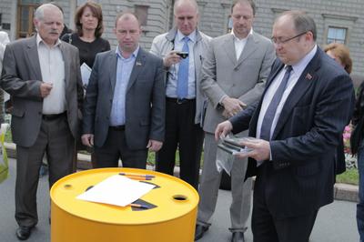 Депутат Госдумы РФ от КПРФ, секретарь Ленинградского обкома КПРФ Николай Кузьмин доставил в Санкт-Петербург «ядерную бочку» и заявил о создании коалиции экологических организаций.