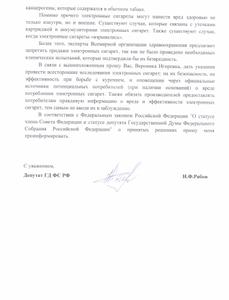 Н.Ф. Рябов направил обращение Министру здравоохранения и социального развития РФ В.И. Скворцовой с просьбой провести соответствующие исследования на безопасность и эффективность электронных сигарет. Н.Ф. Рябов мотивирует свое обращение тем, что до сих пор в России не были проведены всесторонние исследования того, как электронные сигареты воздействуют на здоровье и так ли они безопасны для организма, как заявляют производители.