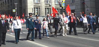 Колонна демонстрантов в этом году, как и в прошлые годы, была солидной: здесь шли не только ветераны, но в большинстве своем молодежь. Колонна была сплошь алой, так как огромное количество красных флагов и флажков, которые несли практически все участники демонстрации, придавали колонне ни с каким другим цветом несравнимый алый колорит. Поскольку была теплая погода, было много детей с шарами.