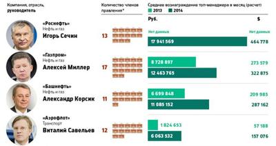 В 2014 г. каждый член правления Газпрома получил в среднем по 150 млн. руб. (общая сумма составила 2,5 млрд. руб. (+43% к 2013 г.), среднемесячное вознаграждение топ-менеджера составило около 12,5 млн. рублей.