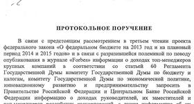 В связи с предстоящим рассмотрением в третьем чтении проекта федерального закона «О федеральном бюджете на 2013 год и на плановый период 2014 и 2015 годов» и в связи с разразившейся полемикой по поводу опубликования в журнале «Forbes» информации о доходах топ-менеджеров крупных компаний, в соответствии со статьей 60 Регламента Государственной Думы Комитету Государственной Думы по бюджету и налогам, Комитету Государственной Думы по экономической политике, инновационному развитию и предпринимательству запросить в Правительстве Российской Федерации и Центральном Банке Российской Федерации информацию о доходах руководителей, их заместителей и топ-менеджеров российских госкорпораций, а также информацию об их зарубежных активах.