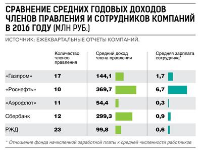 Так, по итогам 2016 г. топ-менеджеры «Газпрома» заработали 2,5 млрд. рублей, а «Роснефти» — 3,7 млрд. рублей. Правление «Роснефти» в I квартале 2017 года получило бонусы в размере 1,5 миллиарда рублей, что в сто раз больше, чем премия правлению в I квартале 2016 года, когда топ-менеджеры получили только 14 миллионов рублей премии. В «Роснефти» заявили, что выплата значительной премии в первом квартале связана с успешным закрытием ряда сделок, в том числе покупки у государства «Башнефти» и продажи инвесторам 19,5 процента акций «Роснефти». В среднем суммарный размер бонусов правления «Роснефти» по итогам 2016 года составляет около 3 миллиардов рублей (Ист.: ).