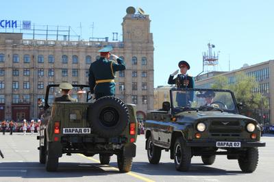 Торжественным маршем по главной площади города прошли военнослужащие 20-й мотострелковой и 56-й десантно-штурмовой бригад, железнодорожного корпуса, бригады внутренних войск, военнослужащие роты Почетного караула. Механизированную колонну возглавил легендарный танк Т-34. За ним проследовали ретроавтомобили ГАЗ-369 и «Виллис», бронеавтомобиль «Тигр», боевая разведывательная дозорная машина БРДМ-2М, БТР-80, артиллерийская система «Рапира» и «Град-М». Специально к празднованию Дня Победы Сводный оркестр Волгоградского гарнизона исполнил парадные, встречные марши, а также несколько маршей времен Великой Отечественной войны.