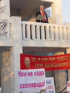 За минувшие летние месяцы мы, члены КПРФ, собрали два миллиона подписей за отставку правительства Медведева. Перед нами, коммунистами, стоит большая задача: добиться отставки этого правительства. Мы требуем: правительство непрофессионалов – в отставку! Нужно правительство народного доверия. А воры и жулики должны сидеть в тюрьме! Считаю, что мы и те, кто с нами сегодня, обязательно победим. Мы должны обеспечить будущее нашей молодежи, нашего города, нашей страны!».
