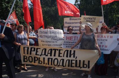 Вышедшие на митинг точно не будут сожалеть о гражданской пассивности. Мероприятия получилось ярким, громким, насыщенным. Люди держали в руках плакаты с лозунгами: «Реформаторы, ищите деньги в своих карманах», «Помоги государству - умри до пенсии», «Мы требуем увеличения пенсий, а не пенсионного возраста», «Единая Россия», руки прочь от наших пенсий, «Пенсионная реформа – ограбление трудящихся», «Пенсионный возраст повысили, а работой обеспечите?», «Нет повышению НДС и НДФЛ» и другие. Было множество самодельных плакатов. Например, растяжка «Предатели, воры, подлецы» адресованная власти. В ход пошли даже теннисные ракетки, на них были перечёркнуты цифры 63 и 65, символизирующие возможное повышение пенсионного возраста до этих отметок. Множество плакатов с требованиями обманутых вкладчиков.