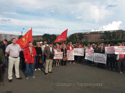 Черногорск. В этом втором по величине городе Хакасии на митинг собралось более 700 человек. Среди собравшихся более половины – молодёжь, чьи интересы ущемлены прежде всего. Черногорцы пришли на митинг семьями, с маленькими детьми. Вёл митинг секретарь горкома КПРФ Виктор Кряжев. Первым выступил лидер местных коммунистов, депутат горсовета Пётр Синьков, выдвинутый кандидатом в Верховный Совет республики. Своим ярким выступлением он задал настроение всей акции протеста. На митинге выступили секретарь рескома КПРФ по протестному движению, депутат горсовета Оксана Разварина, депутат Верховного Совета Евгений Молостов, который также намерен бороться за мандат народного избранника в новом созыве парламента республики, коммунисты Владимир Грудинин (также кандидат в депутаты Верховного Совета), Андрей Кондратьев, неравнодушные жители Черногорска.