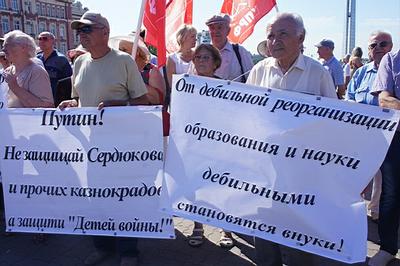 «Даешь народное Правительство!», «Правительство Путина-Медведева - в отставку!», «Дети войны становитесь в ряды КПРФ по защите своих прав и справедливости», «Формула капитализма: народу – шиш, буржуям – барыш!», «Руки прочь от народного избранника – депутата Государственной Думы Бессонова Владимира Ивановича!», «Депутаты ГосДумы РФ и Законодательного Собрания РО не тяните, принимайте закон «О детях войны», «Народ! Объединяйся, с колен вставай. Пора просыпаться, себя защищать», «Дети войны, пережившие ужасы войны, нуждаются в помощи и заботе государства», «От дебильной реорганизации образования и науки дебильными становятся внуки» - эти и многие другие плакаты отразили настроения и основные чаяния общества. Эту истину подтвердили и выступающие на митинге.