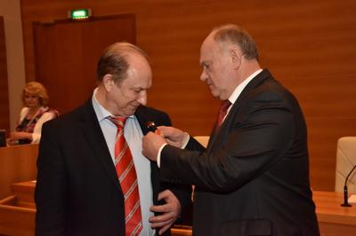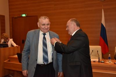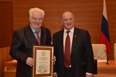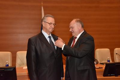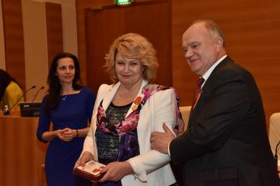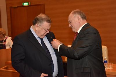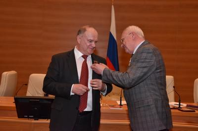 Председатель ЦК КПРФ, Руководитель фракции КПРФ Г.А. Зюганов вручал участникам заседания награды и грамоты Государственной Думы, а также памятные медали ЦК КПРФ "70 лет Победы".