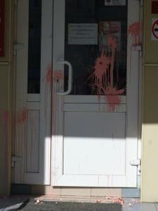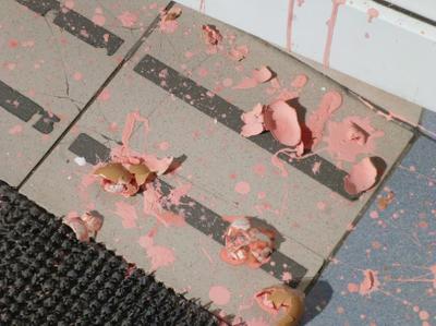 Хулиганы кинули в дверь не менее 6 яиц, что подтверждается количеством скорлупы и следами на двери. Об инциденте было сообщено в правоохранительные органы. Предварительно действия злоумышленников можно квалифицировать как "Мелкое хулиганство". Органы внутренних дел проведут проверку по данному факту. На месте правонарушения был обнаружен отпечаток руки, возможно принадлежащий "стрелкам". Сейчас он будет сверяться с базой данных МВД. Кроме того, выяснилось, что в яйца специально закачали краску, заклеив их скотчем.