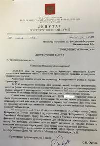 В связи с выходом предвыборной кампании в Краснодаре на стадию уголовного беспредела депутат Государственной Думы Федерального собрания Российской Федерации от Краснодарского края С,П.Обухов направил срочный депутатский запрос в адрес Министра внутренних дел Российской Федерации Колокольцева
