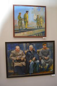 Две работы старейшего художника-коммуниста Владимира Кирилловича Шкиля посвящены Великой Отечественной войне. На одной - "Большая тройка" (Сталин, Рузвельт и Черчилль) в Ялте 1945 года. На другой - советские солдаты, которые сражались с японцами в Маньчжурии в августе 1945 года. Это поистине документальный взгляд, ведь и сам Владимир Кириллович был участником тех боев.