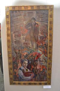 Есть на выставке и две работы, изображающие Ленина. Ирина Анатольевна Леденева назвала свою работу «Наша история». Картина датирована 2017 годом. Вождь революции как бы идет к зрителю, приближаясь к мальчику на переднем плане, который держит толстую книгу «1917-2017: История». Заслуженный художник Валерий Петрович Марченко изобразил молодого Ленина в ссылке в Шушенском. Называется работа «Сибирь сквозь толщу веков». Это старая работа, 1975 года. Съемочная группа пресс-центра Алтайского крайкома КПРФ записала интервью с Валерием Петровичем около еще одной его старой работы «К свету» (1970). На ней изображены большевики 1917 года и знаменитый когда-то алтайский старик-партизан Гуляев, повторивший в 1919 году легендарный подвиг Ивана Сусанина.