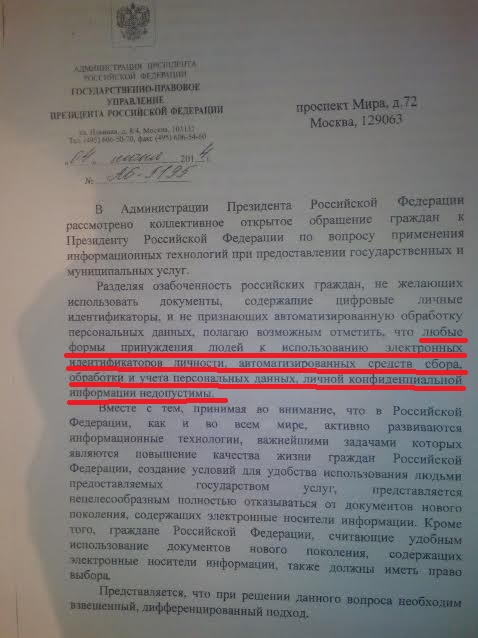 Хотелось также бы обратить внимание (сидящих здесь) представителей Минобороны на позицию Государственно-правого Управления Президента РФ, в котором прямо сказано: любое принуждение людей к использованию электронных идентификаторов личности, автоматизированных систем по сбору и обработки личной, конфиденциальной информации – недопустимы.