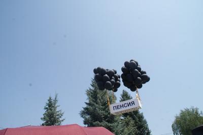 После его выступления молодые коммунисты запустили в небо на черных траурных шарах «пенсию» и гроб с пенсионной реформой.