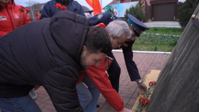 Наш путь начался в Тамани, где мы возложили цветы к памятнику таманцам, погибшим в годы Великой Отечественной войны. Этот памятник представляет собой уникальный танк Т34/76 образца 1941 года, которых до конца войны дошло очень немного. Склонили головы участники эстафеты и перед Мемориалом Боевой славы с братским захоронением советских воинов, погибших в боях с фашистскими захватчиками и расстрелянных советских военнопленных.