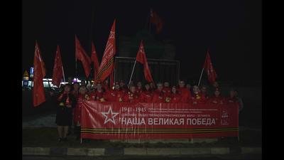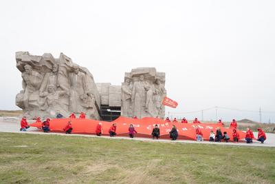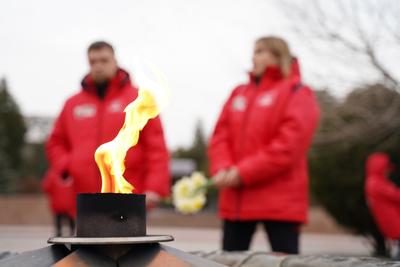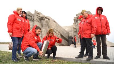 Также участники посетили мемориальный комплекс, расположенный в сквере на площади Ленина. Они возложили цветы к памятнику Ленина и монументу погибшим защитникам города, а также развернули гигантскую копию Знамени Победы.