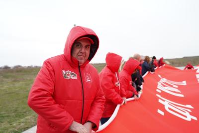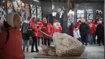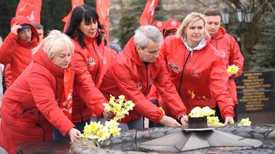 Участники марша-эстафеты возложили цветы к местам гибели и захоронения. А у мемориала над входом в пещеры растянули копию Знамени Победы.