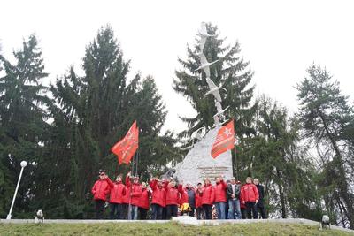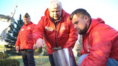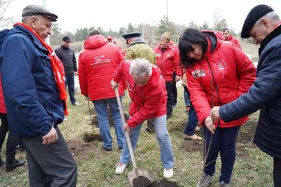 А затем у подножия холма, где установлен памятник воинам 28-й Армии, под мелодии советских песен участники автопробега совместно с коммунистами, комсомольцами и местными жителями высадили саженцы вяза.