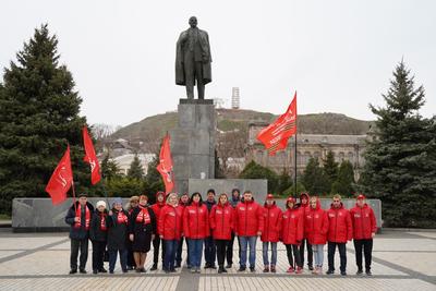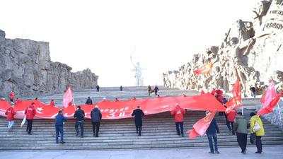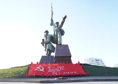 На Мамаевом кургане во время битвы за Сталинград происходили особенно ожесточенные бои, здесь захоронено примерно 35 000 воинов-героев, в их честь в 1959 году выдающимся советским скульптором Евгением Вучетичем был возведен мемориал «Героям Сталинградской битвы». К подножию мемориала «Родина-мать зовет» прибыла автоколонна проекта. Здесь нас встречали коммунисты и комсомольцы города во главе с первым секретарем Сталинградского обкома КПРФ Тамарой Головачевой. Развернув гигантскую копию Знамени Победы, мы проследовали с ней по гранитной лестнице на площадь Стоявших насмерть!