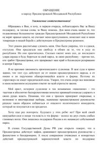 Обращаясь к Вам, я хочу, в первую очередь, поблагодарить Вас за Вашу поддержку, за теплые слова, за Вашу помощь. Для меня очень важно то, что подавляющее большинство граждан Приднестровской Молдавской Республики не верят вранью власти, не считают меня преступником, помогают мне и моим товарищам в нашей борьбе с действующим в Приднестровье режимом.