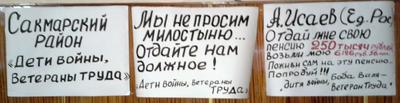 В Оренбуржье стоят тридцатиградусные морозы. В связи с этим намеченный на 2 февраля митинг состоялся в большом зале бывшего здания обкома ВЛКСМ. Пришло до 200 человек. Некоторые с собственными плакатами в руках: «Мы не просим милостыню. Отдайте нам должное!». «Исаев! (депутат Госдумовского комитета по социальным вопросам). Отдай мне свою зарплату в 250 тысяч рублей и забери мою пенсию в 6126 рублей. Поживи сам на такие деньги. Попробуй!»