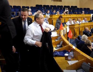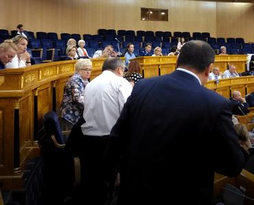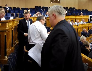 На фото: депутаты фракции КПРФ (слева направо) Николай Кузьмин, Регина Илларионова и Евгений Тирон протестуют против пенсионной реформы; депутаты покидают зал заседаний областного ЗакСа.