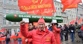 Колонна коммунистов с красными флагами, портретами советских вождей и "ракетой для Обамы" прошла по центру Москвы в понедельник, 23 февраля, в рамках празднования Дня защитника Отечества. Как сообщается на КПРФ, "тысячи людей под красными знаменами прошли от Пушкинской площади до площади Революции, где состоялся митинг", который вели заместитель председателя ЦК КПРФ, первый секретарь московского горкома КПРФ Валерий Рашкин и секретарь МГК КПРФ Александр Потапов.