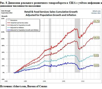 Совершенно удручающе выглядит ситуация с динамикой розничных продаж и потребительской активностью, если скорректировать официальные и крайне политкорректные данные государственных статистических служб на прирост численности населения США. В таком случае прирост розничных продаж за период 1990-2011гг. составит не широко разрекламированные предвыборные 48,2%, а гораздо более скромные 2,2%.