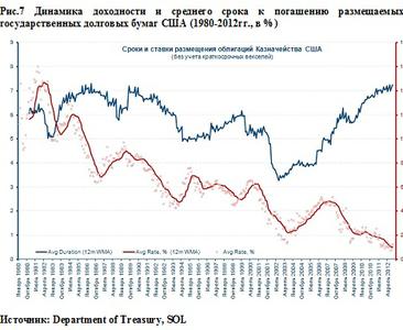 Приблизительно с 2002г., т.е. разгара кризиса дот-комов в США, ставшего первой ласточкой и предвестником глобального финансово-экономического экономического кризиса 2007-2009гг., финансово-экономические власти США проводят курс на увеличение среднего срока заимствований на долговом рынке при одновременном снижении ставки по привлекаемым кредитным ресурсам. Благодаря этой политики финансовым элитам США удалось снизить среднюю ставку доходности по вновь размещённым государственным долговым бумагам с 6% в начале 2000-х годов до 1,2% по итогам середины лета 2012г. Одновременно с этим средний срок обращения государственных облигаций Федерального Казначейства США подскочил с 3,3 лет до 7,3 лет, что позволило рефинансировать краткосрочные долговые обязательства долгосрочными при одновременном снижении стоимости заимствований.
