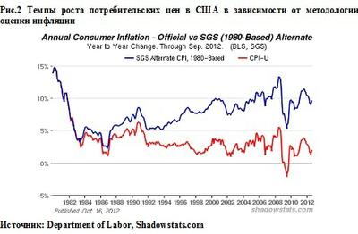 Однако, если прибегнуть к методологии расчёта инфляции 1990г., отказавшись от «инновационных» подходов к статистическому учёту, то прирост потребительских цен в США составляет не менее 5-6%. Более того, если в качестве эталона взять методологию первой половины 1980-х годов, которая в гораздо меньшей степени была подвержена статистическим манипуляциям, то, согласно оценкам независимых экономистов и финансовых организаций, реальные темпы роста инфляции в США не опускаются ниже 9-12%.