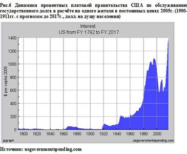 Самое удивительное состоит в том, что, несмотря на практически двукратный рост величины государственного долга США только за последние 11 лет (с 2000 по 2011гг.), благодаря беспрецедентной по объёму эмиссионной накачки финансовых рынков, масштабному выкупу государственных долговых бумаг на баланс ФРС США и, таким образом, искусственному снижению ставки заимствований на рынке государственного долга размер ежегодных платежей американских граждан по уплате процентов в постоянных ценах 2005г. сократился с 1-1,2 тыс. долл. до 570-700 долл.