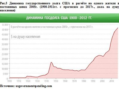 Однако надо отметить тот факт, что только за период с начала 1970-х годов, когда после августовской речи Ричарда Никсона США, по сути дела, объявили дефолт, отказавшись обменивать доллары на золото по фиксированному курсу, долговая нагрузка на одного жителя США в реальном выражении (т.е. с учётом инфляции) подскочила с 7,5 до 41 тыс. долл. Притом что во время Второй Мировой Войны в промежуток 1939-1945гг., даже несмотря на многократный рост бюджетных дефицитов и государственного долга, в расчёте на одного жителя в фиксированных долларах 2005г. размер государственной долговой нагрузки не превышал 17 тыс. долл. А в довоенный период 1900-1935гг. данный показатель и вовсе колебался в диапазоне 500-3000 долл.