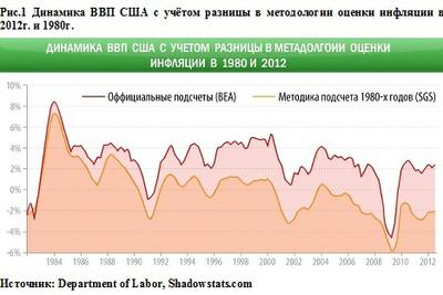 Так, если согласно официальным данным Бюро экономического анализа (BEA) и в разы заниженной оценки инфляции среднегодовые темпы роста американской экономики на протяжении 2000-2011гг. составляли порядка 2%, то с учётом реальной инфляции, рассчитанной по методологии первой половины 1980-х годов, американская экономика не только не растёт, но даже демонстрирует снижение на 2-4% ежегодно.