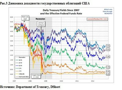 Доходность государственных долговых бумаг США со сроком погашения от 1 месяца до 30 лет опустилась до абсолютных исторических минимумов – доходность 5 летних облигаций обвалилась с 3% в середине 2009г. до 0,79% в октябре, 10-летних – с 4% до 1,5%, а 30-летних с 4,5% до 2,5-3%. Даже в разгар глобального финансово-экономического кризиса 2008-2009гг. и беспрецедентного обвала на финансовых рынках не наблюдалось столь масштабного бегства спекулятивного капитала в «безрисковые» долларовые активы.