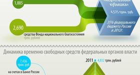 Только за период с начала 2012г. объём лежащих без дела средств Минфина, полученных в результате изъятия денег из экономики под антинаучные рассуждения о борьбе с инфляцией (инфляция в России носит немонетарный характер и обусловлена скачкообразным ростом цен на услуги ЖКХ, ГСМ, транспорт, продовольствие, а также высокими коррупционными поборами, монополизмом и дорогими кредитами), подскочил на 34,7% (с 6,547 трлн. рублей). Тогда как ещё в начале 2011г. размер временно свободных средств федеральных органов власти достигал 4,832 трлн. рублей.