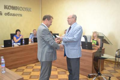 Председатель областной избирательной комиссии С.А. Кузьменко вручил кандидату-коммунисту соответствующее удостоверение.
