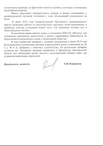 В результате проведённой прокуратурой Пестовского района с привлечением специалистов проверки установлено, что коммунальные беды новосёлов связаны с неудовлетворительным качеством строительства, а также ненадлежащим содержанием муниципального имущества. Однако заставить застройщика, ООО СК «Молога», устранить все недоработки в рамках гарантийных обязательств невозможно в связи с ликвидацией общества.