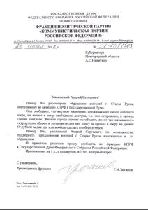 Обида и несправедливость заставили жителей курортного города Старая Русса, что в Новгородской области, обратиться к лидеру КПРФ Г.А. Зюганову. Живя на берегу солёного озера Среднее, местные жители не могут воспользоваться его лечебными свойствами и даже отдохнуть на побережье – закрытая территория.