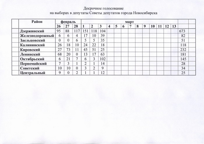 Так, за 6 дней, прошедших с начала досрочного голосования, в Дзержинском районе проголосовало уже 673 человека (по состоянию на вечер 3 марта), а в Кировском районе проголосовало 232 избирателя. Основное количество досрочно проголосовавших в Дзержинском районе зафиксировано на избирательном округе № 2, где идет соперничество коммуниста действующего депутата Горсовета Егора Тюкалова и генерального директора ОАО «Новосибирское авиационное производственное объединение им. В. П. Чкалова» Андрея Калиновского. Налицо административный ресурс, ведь большинство досрочно проголосовавших сотрудники «НАПО им. Чкалова». Похожая ситуация и на соседнем избирательном округе № 3, где в поликлинике № 17 врачам открытым текстом говорилось, что нужно голосовать за Любовь Шпагину, а не за действующего депутата, коммуниста Валентина Пысина. В Кировском районе большинство случаев досрочного голосования зафиксировано на избирательном округе № 16, где идет борьба между коммунистом, редактором газеты «За народную Власть!» Иваном Конобеевым и «единороссом» Александром Тарасовым.