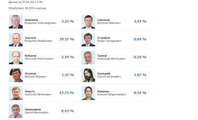 За коммуниста А.Е.Локтя - 43,75% избирателей, а за единоросса А.М.Знаткова, исполнявшего обязанности мэра - 39,57%.