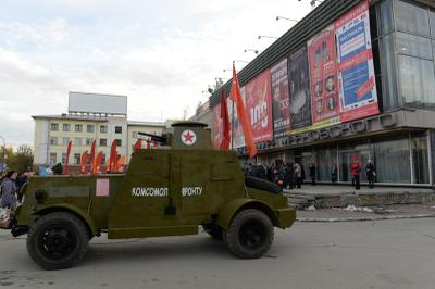 Около входа в киноконцертный зал стоят броневики. Их пригнали бывшие комсомольцы, которые самостоятельно восстанавливают раритетные машины 30-х годов. Все для того, чтобы создать антураж того времени, а также, чтобы показать юным горожанам, на чем воевали их деды и прадеды и привлечь внимание молодежи к истории своей страны.