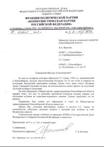 Руководитель фракции КПРФ в Госдуме дважды посылал обращения в органы власти Новосибирской области. Первый раз пришёл ответ из Министерства здравоохранения: Г.С. Гриню выдана справка для получения путёвки на санаторно-курортное лечение, даны разъяснения по порядку организации санаторно-курортного лечения. Но Геннадию Сергеевичу ничего разъяснять и не надо было. Десять лет порядки эти на себе испытывал, и справки ему писали не первый раз. Об этом он рассказал по телефону сотрудникам аппарата фракции КПРФ в Госдуме. И снова пошёл запрос за подписью Г.А. Зюганова, на этот раз в Министерство труда и социального развития Новосибирской области.