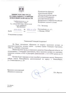 И вот получен ответ: «…По согласованию с Геннадием Сергеевичем была выделена путёвка на санаторно-курортное лечение в ОАО «Санаторий «Доволенский» с 12.11.2018 сроком на 14 дней».