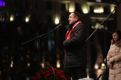 «Красный мэр» рассказал о своей встрече с ветеранами, о том, как представители старшего поколения просили вернуть 7 ноября статус государственного праздника. Свое выступление он завершил словами: «Да здравствует социализм! Да здравствует Россия!» После этого на большом экране возле сцены появилось видеообращение Председателя ЦК КПРФ Геннадия Зюганова. Лидер коммунистов России подчеркнул: столетний юбилей Великой Октябрьской социалистической революции достойно встречает вся планета, в каждом уголки Земли есть те, кто думает об Октябре. В то же время сама Россия 100 лет назад начала путь к социализму в сложной исторической обстановке — об этом, по мнению Геннадия Зюганова, не стоит забывать.