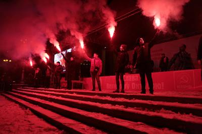 7 ноября в Новосибирск вернулись обильные снегопады, однако для сотен жителей города это не стало преградой. В 17-00 возле Дома офицеров люди начали строиться в колонны — в первых рядах с растяжкой коммунистической партии традиционно встала левая молодежь.