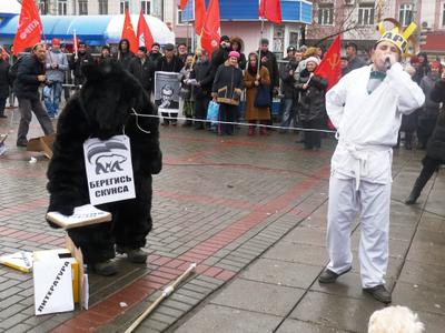 По окончании выступлений была разыграна сцена: скунс, очень похожий на «едросовского» медведя, принялся громить палкой университеты, школы, детские дошкольные учреждения (все эти «объекты» были сфотографированы, приклеены к картонному основанию и выставлены прямо на асфальт). И наверняка все это кончилось бы разгромом образования, если бы группа коммунистов с красными флагами не укротила этого буяна.