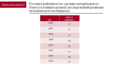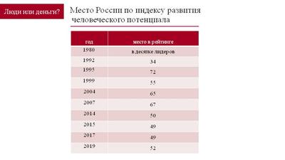 В советский период, как показали специальные исследования Центра по изучению человеческого капитала при Министерстве образования РФ, выполненные обратным счетом, мы входили в десятку лучших стран. Некоторые исследователи полагают, что в тройку. Однако это доказать труднее. Даже в страшном кризисном 1992 году мы были еще 34-ми. Затем опускались до 72-го места. Некоторые годы были в седьмом десятке. Затем поднимались до 49-го места, входя в группу стран с очень высоким уровнем человеческого потенциала. В настоящее время из нее выпали, но, занимая 52-е место, остались в группе с высоким уровнем его развития.