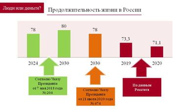 Согласно Указу Президента от 7 мая 2018 года №204, ожидаемая продолжительность жизни в России должна была составить в 2024 году 78 лет, а в 2030 году – 80 лет. Однако Указом от 21 июля 2020 года №474 этот показатель пересмотрен. Теперь 78 лет мы должны достичь только в 2030 году. Что же касается реальной ожидаемой продолжительности жизни, то в результате пандемии она снизилась с 73,3 до 71,1 года.