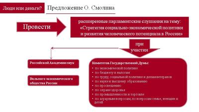 Предлагаю провести расширенные парламентские слушания на тему: «Стратегия социально-экономической политики и развития человеческого потенциала в России» с участием академии наук и Вольного экономического общества по поводу стратегии экономической и социальной политики и развития нашего человеческого потенциала на среднесрочную перспективу.