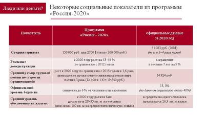 Напомню: согласно программе «Россия-2020», с которой партия «Единая Россия» шла на выборы 2011 года, в 2020 году средняя зарплата граждан России должна была составить около 2700 долларов, но не менее 150 тысяч руб. Мы двумя руками «за». Но на самом деле в 2020 году средняя зарплата составила 51 083 руб. (708 долларов). Хочется спросить: кто же популист?
